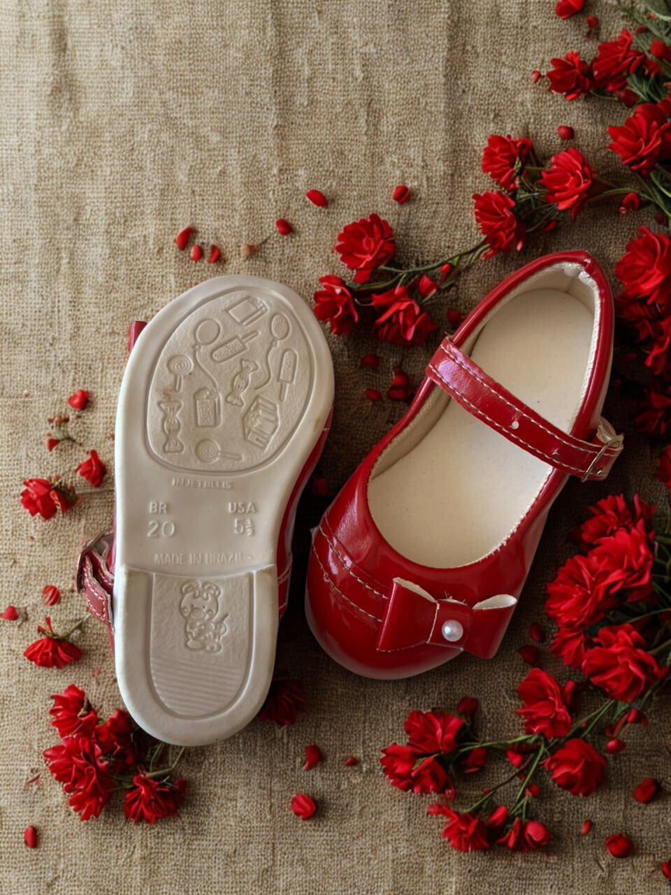- Características do modelo da foto: As sapatilhas da imagem são de verniz vermelho, com um laço na parte frontal decorado com uma pérola, e fecho de fivela.